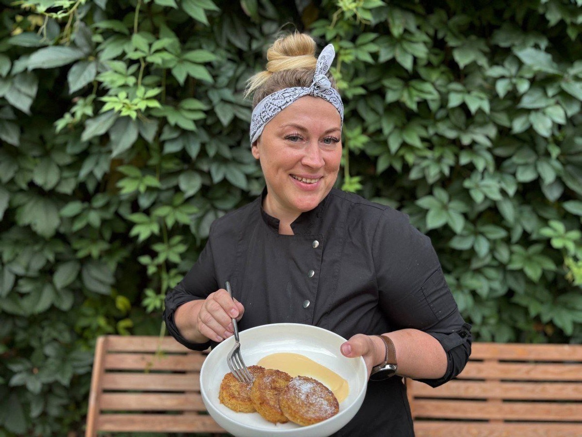 Сегодня делимся рецептом Татьяны Хотылевой, бренд-шеф Cake&Breakfast и Pan&Cake! В меню Cake&Breakfast и Pan&Cake есть блюдо, ставшее легендой, знакомое каждому гостю. Секретом этого блюда так часто интересуются, что мы решили: пришло время поделиться рецептом этого хита! Татьяна предлагает попробовать ее фирменный рецепт — готовьте, пробуйте, творите! Для 10 штук оладий вам понадобятся: 1. Помыть и очистить яблоки от кожуры и сердцевины. 2. Натереть яблоки на терке и хорошо отжать сок (сок далее не потребуется). 3. Равномерно смешать отжатые яблоки с сахарной пудрой, яйцами и мукой. 4. Разделить всю массу на части по 65-75 г. 5. Сформировать оладьи с помощью кулинарного кольца диаметром 8-10см. 6. Разогреть растительное масло на сковороде и обжарить до красивого золотистого (не очень темного, скорее ближе к светлому) цвета. 7. На подготовленный противень с пергаментом выложить оладьи и довести до готовности в течение 8-12 минут (в зависимости от вашей печки) в духовке или конвек