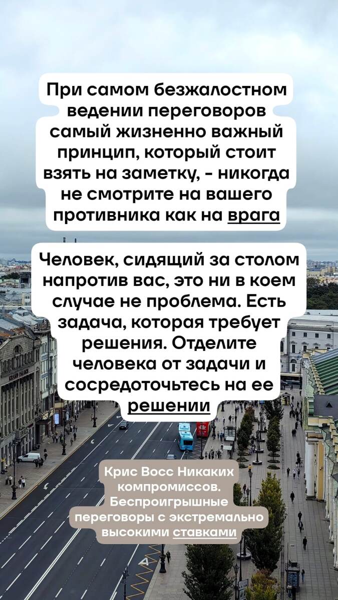 Практически все теории и методы переговоров опираются на силу интеллекта, логику и авторитетные анаграммы. Так учат. Так пишут. В то время как человек всегда остается животным, которое действует исходя из своих, глубоко спрятанных страхов, потребностей, представлений и желаний. "Никаких компромиссов. Беспроигрышные переговоры с экстремально высокими ставками" за авторством Криса Восс я читала больше месяца. Перечитывая абзацы и целые главы. Конспектируя и запоминая. Автор книги - человек, который вел переговоры по освобождению от заложников в разных концах планеты. Ему точно можно доверять. Правила описанные им просты. ✅ задавайте вопросы, требующие развернутого ответа. Ваши вопросы должны быть четко выверенными ✅ слушайте! До тех пор, пока вы не выясните, с чем имеете дело, вы не знаете, с чем имеете дело ✅ слушайте! Уметь выслушать человека - действительно непростая задача ✅ слушайте! С тем, чтобы понять и принять человека ✅ фраза "все правильно", произнесенная из уст вашего противн