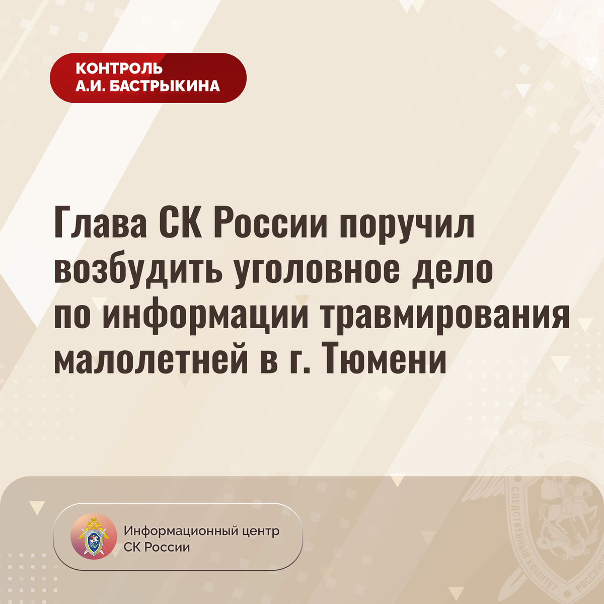 Глава СК России поручил возбудить уголовное дело по информации травмирования малолетней в г. Тюмени
