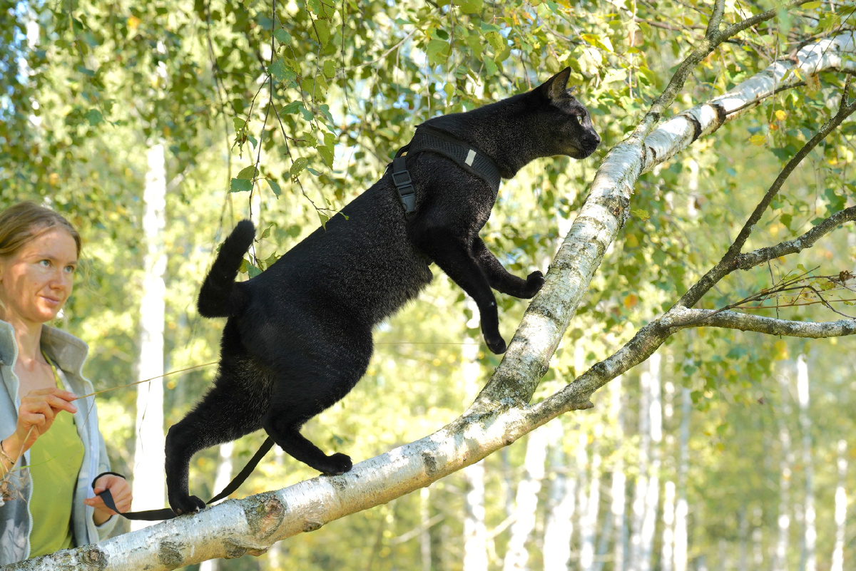 Я начала замечать, что гулять с Лимоном мне стало намного комфортнее. Впрочем, как и ему (возможно, именно в этом причина моего все увеличивающегося спокойствия рядом с котом на улице). Конечно, наши выходы все еще требуют предварительной подготовки, такой, как, например, закрывание алабаев, чтобы они не пошли знакомиться с чаузи слишком близко, до смерти его пугая, или подгадывание времени, когда к нам не должна приехать никакая машина, которых Лимон тоже боится. Однако это все равно больше не тот дрожащий от страха кот, который выходил на улицу год назад. Мы не просто стали больше доверять друг другу – мы начали вместе исследовать окружающий мир. Лимон открывает для себя новые поверхности. Помимо почвы, он ходит до доскам, иногда шатающимся, блокам, мокрым лужам, шуршащему баннеру, запрыгивает на столы, а недавно я начала приучать его лазить по низким веткам деревьев. То есть лазить кот, наверное, умел по умолчанию, но, возможно, сам не знал об этом. Или не догадывался о том, что ему