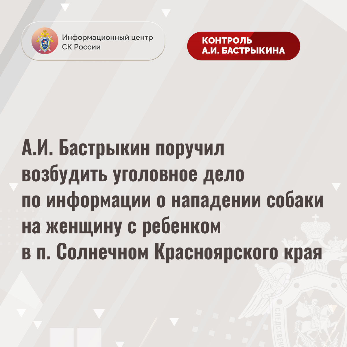 А.И. Бастрыкин поручил возбудить уголовное дело по информации о нападении собаки на женщину с ребенком в п. Солнечном Красноярского края В социальной сети сообщается, что в сентябре текущего года в поселке Солнечном Красноярского края собака, находившаяся на выгуле без поводка и намордника, набросилась на шестилетнего ребенка, после чего укусила его мать. Женщине потребовалась медицинская помощь. Отмечается, что ранее животное неоднократно проявляло агрессию и нападало на прохожих, однако владельцем мер реагирования не принимается. В ГСУ СК России по Красноярскому краю и Республике Хакасии организована процессуальная проверка. Председатель Следственного комитета Российской Федерации Александр Иванович Бастрыкин поручил руководителю ГСУ СК России по Красноярскому краю и Республике Хакасии Алексею Леонидовичу Еремину возбудить уголовное дело и доложить о ходе и результатах его расследования. Исполнение поручения поставлено на контроль в центральном аппарате ведомства. #СледственныйКомит