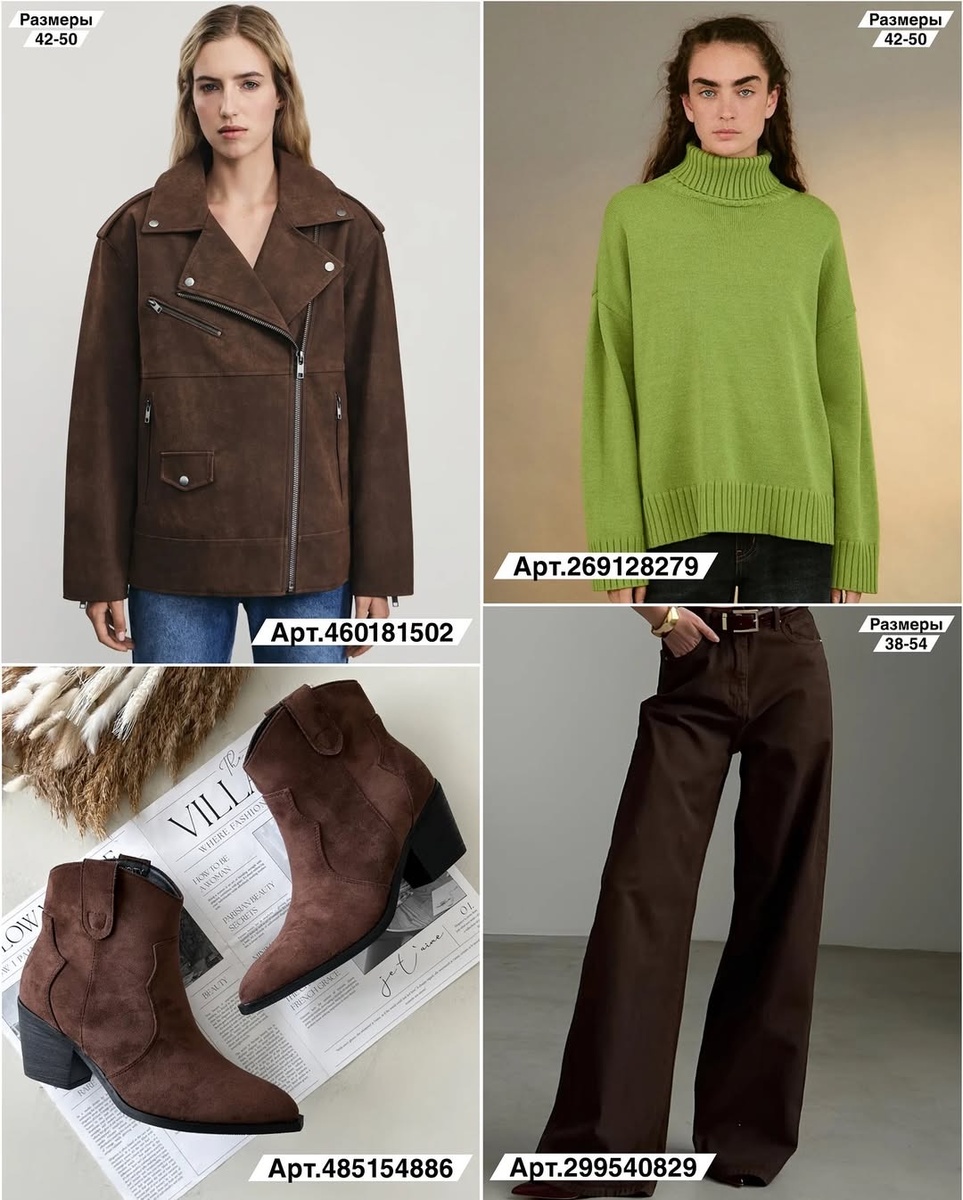 - Комбо: с косухой (Арт.460181502) и ботильонами (Арт.485154886) — готовая монохромная база; с зелёным свитером (Арт.269128279) — модный контраст.
