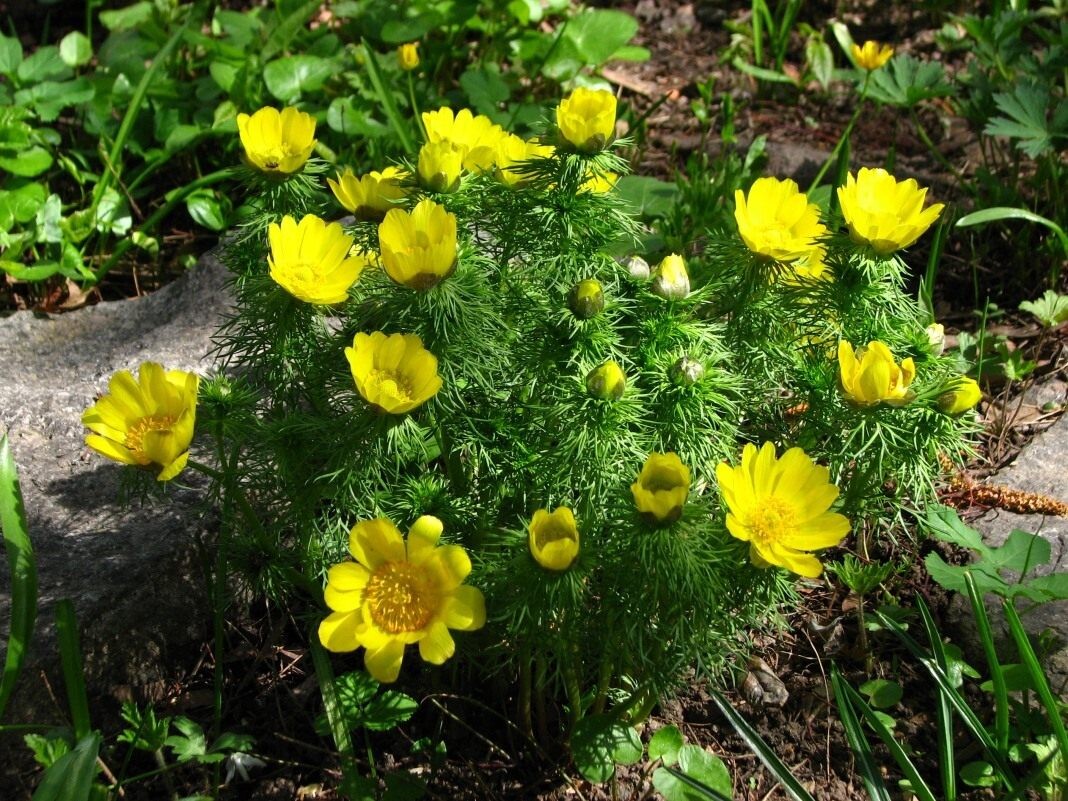 - Адонис амурский (Adonis amurensis) — многолетник с желтыми, а порой и розоватыми махровыми цветами, приветствующий мир в конце апреля.