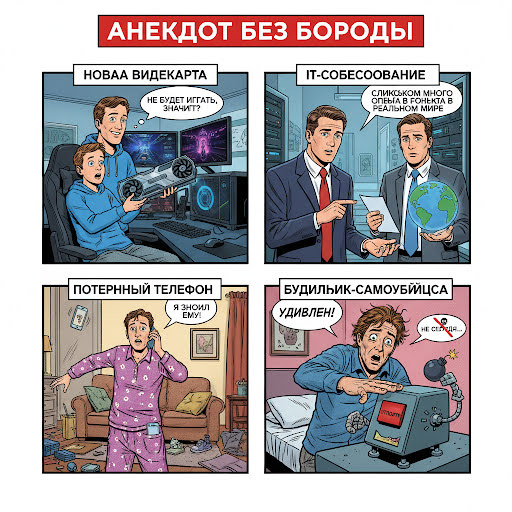 — Мой сын сказал, что он больше не будет играть в компьютерные игры. — И что ты сделал? — Я купил ему новую видеокарту. — Я пытался устроиться на работу в IT-компанию. — И что? — Мне сказали, что у меня слишком много опыта в реальном мире. — Я не могу найти свой телефон. — А ты пробовал его поискать? — Конечно! Я даже ему звонил, но он не отвечает. — Почему ты так удивлён? — Я только что узнал, что мой будильник — это робот-самоубийца. Он каждый день пытается покончить с собой, но я всегда нажимаю на "отложить".