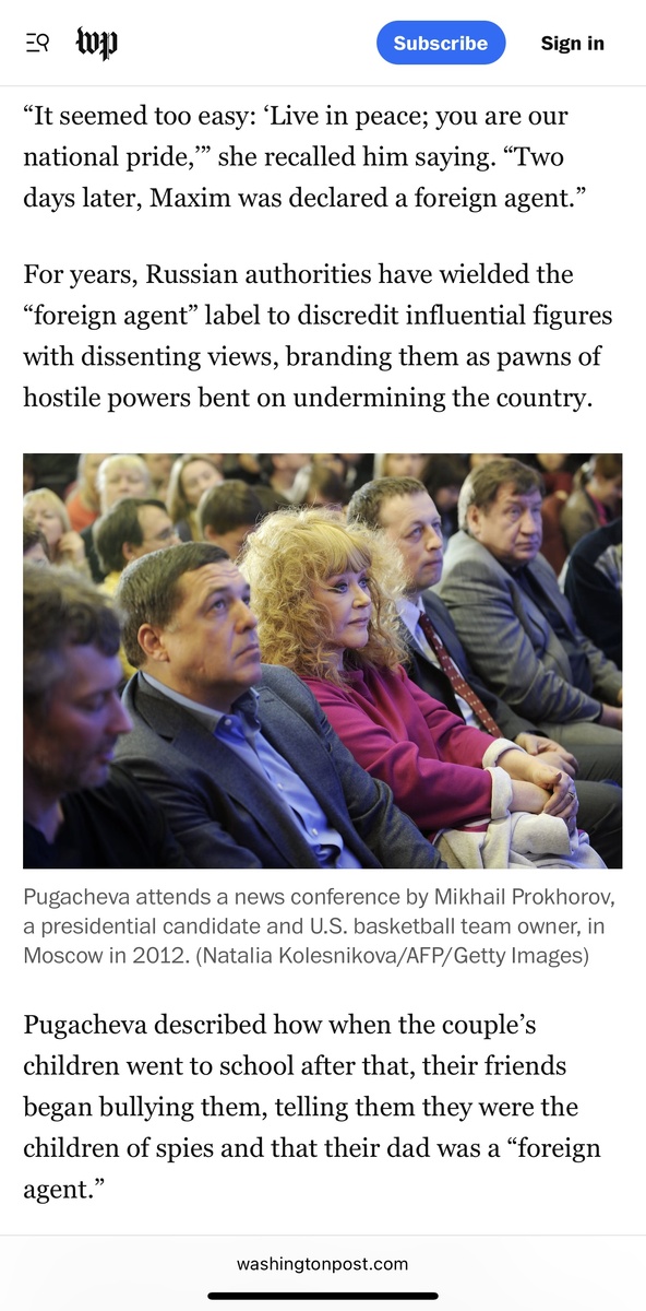 «Нужно ли нам на элементарном уровне объяснять, что некоторые люди не хотят жить в коммуналке? Что некоторые хотят иметь собственное жильё?» — сказала Пугачёва, имея в виду попытки России подорвать независимость Украины. Пугачёва, как известно, скрывает свою личную жизнь и избегает интервью. Последнее большое интервью, которое она дала СМИ, было более семи лет назад. «У нас в России не так много звёзд, не то что на Западе. Она — невероятно мощный, но обычно молчаливый символ», — сказала Гордеева* в телефонном интервью The Washington Post. «Её отъезд из России стал важным знаком». Большинство россиян в возрасте Пугачёвой предпочли стабильность и комфорт совести. «Мне было совершенно ясно, какую сторону она заняла», — сказала Гордеева*. Гордеева заявила, что обсуждала возможность интервью с Пугачёвой, чтобы рассказать свою версию событий, с 2022 года. Наконец, этой весной Пугачёва сказала Гордеевой*, что «время пришло». «Она не устанавливала никаких границ», — сказала Гордеева*. «Она лиш
