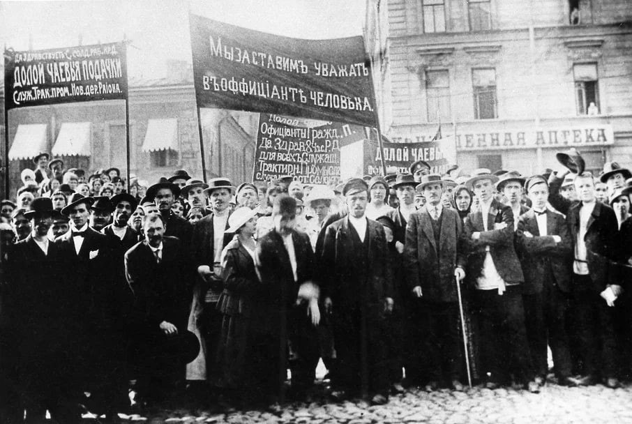 Меня в своё время впечатлила эта история и заставила заняться ею плотнее. Вот и вам её расскажу. Летом 1917 г. в России, разгорелась борьба... за отказ от чаевых. В марте в Петрограде появился первый профсоюз работников ресторанов и трактиров. К июню в нём числилось до 15 тыс. человек. Затем к петроградцам присоединились их коллеги из Москвы, Киева, Харькова, Самары и других городов. Кто бы ожидал от официантов, лакеев и швейцаров солидарной борьбы за свои права? Но вот, что "Петроградский листок" писал об этом движении: "Они требуют, чтобы все - и хозяева, и посетители ресторанов и трактиров - обращались с ними на "вы". Они требуют отмены унизительных требований хозяев, запрещавших носить своим сотрудникам усы и бороды, очки или пенсне". Однако самое принципиальное требование — отказ от чаевых. В новой России, где все граждане равны, чаевые воспринимались как унижение. В ресторанах появились таблички "Здесь на чай не берут" или "Если человек служит за столом, это не повод оскорблять