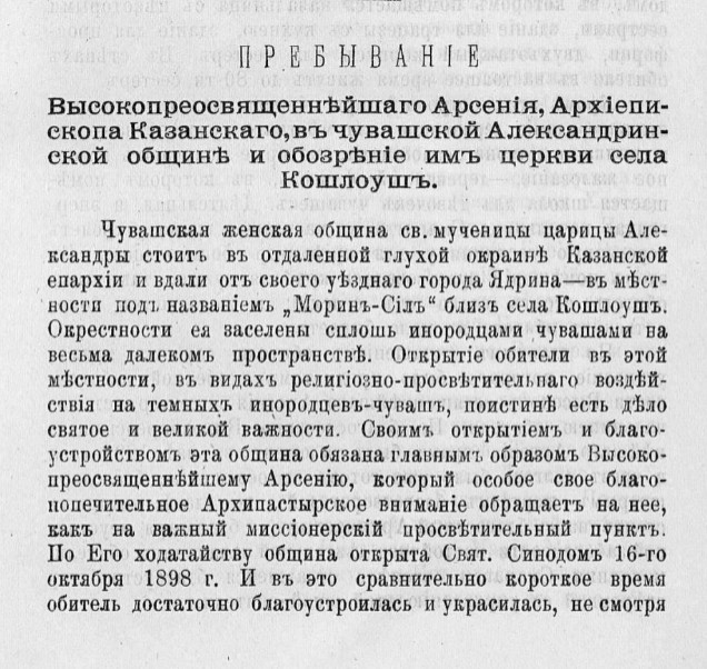 Высокопреосвященнейшего Арсения, Архиепископа Казанского, в чувашской Александринской общине и обозрение им церкви села Кошлоуш.