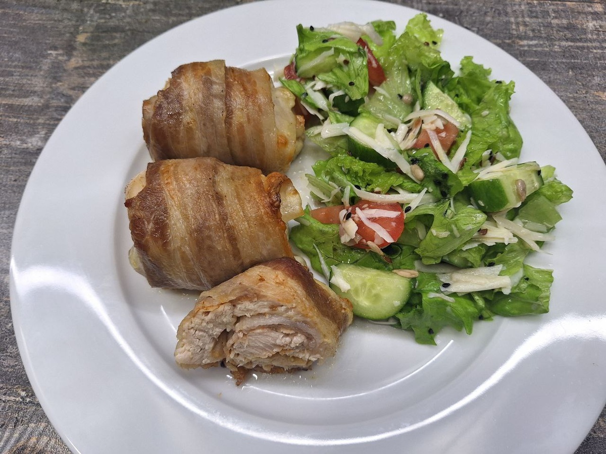 Куриные рулетики с сыром и беконом — это простое, но эффектное блюдо, которое отлично подходит и для повседневного ужина, и для праздничного стола. На этот раз мы приготовим их из куриной грудки: она менее жирная, чем мясо с бёдер, но при правильной подготовке получается нежной и очень вкусной. Секрет сочности — в беконе, который удерживает влагу, и в начинке из моцареллы. Сначала подготовьте грудку. Затем аккуратно отбейте молоточком через пищевую плёнку, чтобы мясо стало тоньше и равномернее. Такой приём помогает грудке готовиться быстрее и сохранять сочность. Присыпьте мясо солью, чёрным перцем и копчёной паприкой. Лёгкая дымная нотка от паприки сделает рулетики ароматнее и подчеркнёт вкус бекона. Теперь займитесь сыром. Моцареллу обсушите от влаги и нарежьте брусочками. Если используете плотную моцареллу для пиццы, она будет лучше плавиться и тянуться. На разделочной доске разложите две полоски бекона. Сверху положите пласт куриного мяса. На край выложите кусочек сыра. Можно до