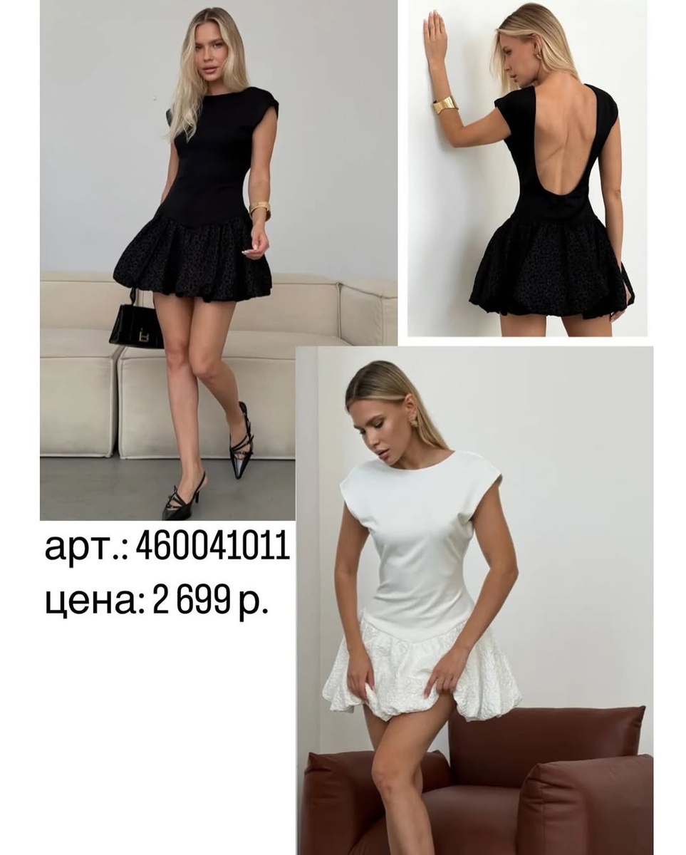 1) Платье-мини с архитектурным верхом и открытой спиной — арт. 460041011 (≈ 2 699 ₽)