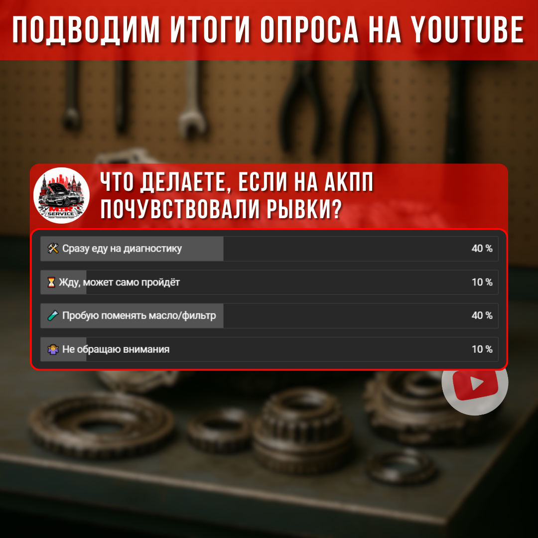 👋🏼 Друзья, на связи MTR Service! Мы спросили вас: что вы делаете, если на АКПП чувствуются рывки? 📊 По итогам: 40% сразу едут на диагностику, 40% пробуют поменять масло и фильтр, 10% ждут, что пройдёт само, и ещё 10% не обращают внимания. ⚙️ Теперь разберём. Игнорировать рывки или ждать, что они исчезнут — это самая большая ошибка. АКПП не лечится сама, а мелкая проблема быстро превращается в капитальный ремонт. Замена масла и фильтра может помочь только если причина в грязи или перегреве, но если дело в гидроблоке или износе фрикционов — это не решит проблему. 🔧 Самое правильное решение — сразу ехать на диагностику. Только так можно понять точную причину и избежать серьёзных затрат. 👉 Отправь этот пост знакомому, который думает, что коробка «сама разработается». Поставь лайк, если узнал что-то полезное. 📝 Записывайтесь на диагностику АКПП! Мы используем оригинальное оборудование и даём гарантию на работы.