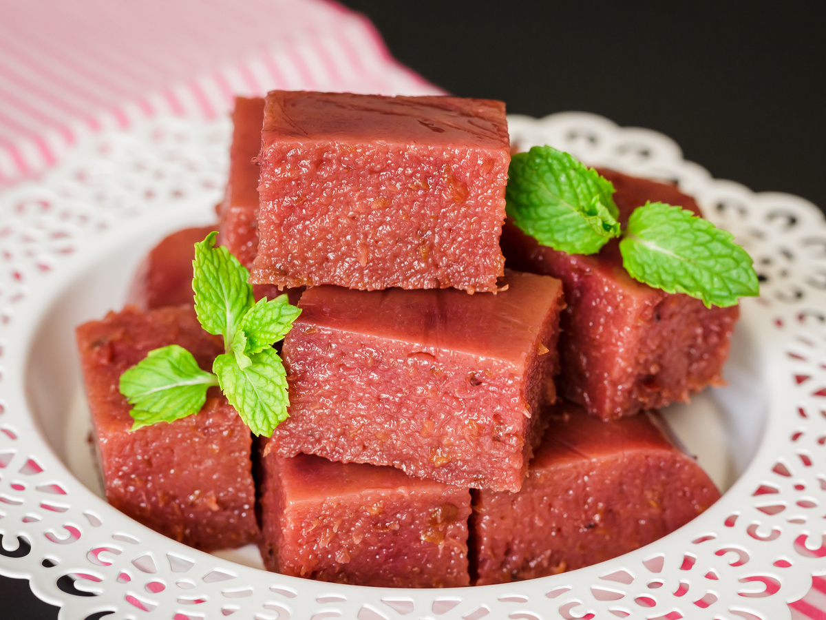 Полный список ингредиентов – в конце⤵ Берём 400 г слив. Сливы должны быть мягкими – от них зависит и цвет, и вкус. Если они замороженные – предварительно размораживаем. Вырезаем косточки, мякоть измельчаем блендером в пюре. Всыпаем 5 ст.л. сахара (можно меньше, если сливы сладкие) и ставим на средний огонь. Провариваем 5 минут, помешивая, чтобы масса чуть загустела. Отдельно замачиваем 7 г агар-агара в 50 мл тёплой воды – строго на 20 минут. Больше фото смотрите тут: Потом добавляем его в горячую сливовую массу. Варим ещё 2-3 минуты – постоянно мешаем, чтобы агар разошёлся и сработал. Смесь выливаем в форму, застеленную пищевой плёнкой. Даём остыть при комнатной температуре, затем убираем в холодильник ми