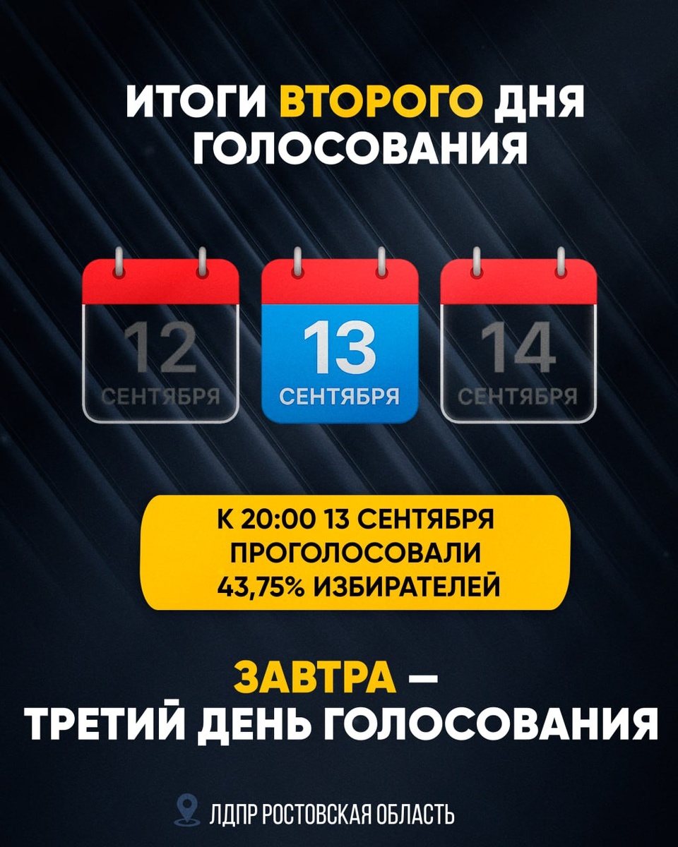 Явка на выборах в Ростовской области к вечеру второго дня 🇷🇺 К 20:00 13 сентября в выборах в Ростовской области приняли участие 43,75% избирателей. ➡️ С учётом дистанционного электронного голосования свой выбор сделали уже 1 357 720 жителей региона. ✨✨✨ Ростовское региональное отделение ЛДПР отмечает высокую активность граждан. Впереди ещё один день голосования, и именно от участия каждого зависит, каким будет будущее Дона. ➡️ Избирательные участки открыты с 08:00 до 20:00. ❗️За соблюдением порядка на участках следят наблюдатели, а правовой штаб «ЛДПР.Кольчуга» работает в круглосуточном режиме, принимая обращения граждан. ☎️ Любой житель донского края может позвонить по номеру 8 800 200 33 33 и сообщить о нарушении на выборах в своём регионе. Приходите и сделайте свой выбор! Дорогие подписчики, благодарим Вас за поддержку! Ваши реакции, приглашения друзей и репосты позволяют нам развиваться. Не забывайте ставить 👍👍👍