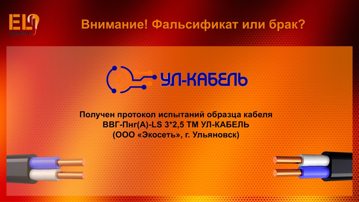 EL-Комитетом НОПСМ получен протокол испытаний образца кабеля ВВГ-Пнг(А)-LS 3*2,5 ТМ УЛ-КАБЕЛЬ, производства, согласно маркировки, ООО «Экосеть» (г. Ульяновск). Данный образец был закуплен в магазине производителя продукции на площадке ОЗОН. По результатам технических испытаний отобранного образца кабеля были выявлены отклонения до 2,5% по показателю «электрическое сопротивление токопроводящих жил» (п. 5.2.2.1 ГОСТ 31996-2012). Полученные результаты испытаний могут быть свидетельством нестабильной работы системы контроля качества выпускаемой продукции на производстве ООО «Экосеть». В рамках дальнейшего мониторинга продукции данного производителя будет уделено особое внимание. Подчеркнем, что EL-Комитет НОПСМ открыт для конструктивного сотрудничества с производителями кабельной и иной электротехнической продукции. Уверены, что наш опыт и компетенции могут оказать посильную помощь в перестройке системы контроля качества для обеспечения безопасности выпускаемой продукции. 👉 Результаты исп