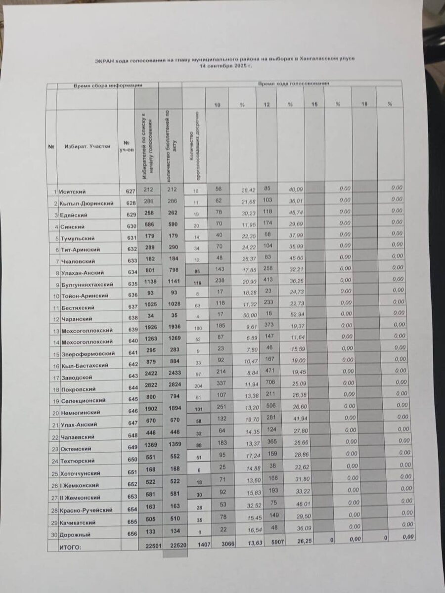 Предварительные итоги хода голосования на муниципальных выборах главы МР «Хангаласский улус», 14 сентября 2025 г., 12:00 часов.