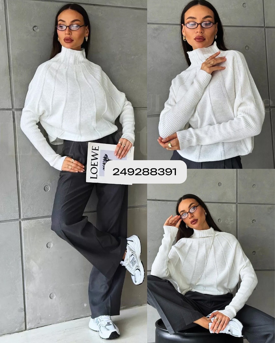 - Пн: 249288391 + серые прямые брюки + лоферы — деловой минимализм.