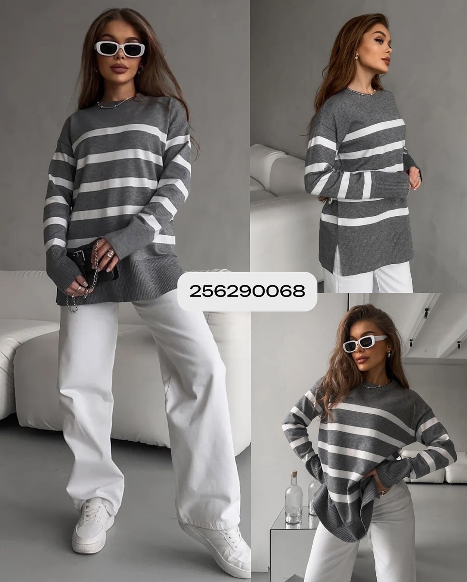 Плотный хлопково-акриловый трикотаж, удлинённый силуэт до середины бедра, ровный низ с небольшими разрезами по бокам, приспущенное плечо и удлинённые манжеты (можно закрыть кисти — выглядит модно и уютно). Полоска бело-серая, ритм ровный — смотрится аккуратно и «дорого».