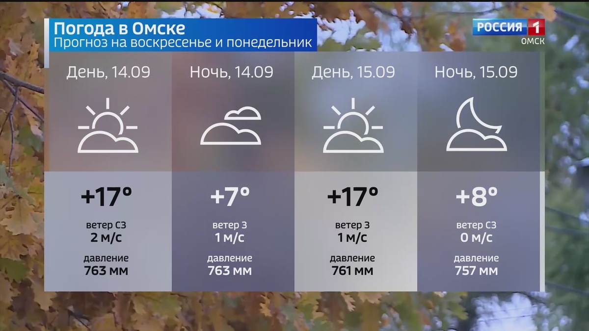 Сегодня днём ожидается до +17°C. Ветер будет дуть со скоростью 2 м/с. Ночью температура понизится до +7°C, ветер ослабнет до 1 м/с. В понедельник, 15 сентября, днём воздух прогреется до +17°C. Ветер слабый, около 1 м/с. Ночью ожидается +8°C, ветер будет практически отсутствовать.