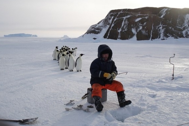 На видео Степка, небольшой императорский пингвин, сутулясь, важно расхаживает около лунок. Ждет улова. Снег под его лапами скрипит, будто у мужика под валенками в Сибири. Он вообще не боится людей. Вот промахнулся и — ап! — вместо рыбы цапнул бородатого полярника за палец. Но Игорь уверяет, что кусаются пингвины небольно.