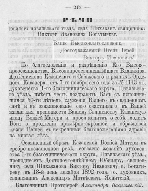 Освященный образ Казанской Божией Матери в сребро-позлащенной ризе, согласно желанию духовенства 1-го благочиннического округа, Цивильского уезда, преподнесет Достопочтеннейшему Юбиляру, священнику села Шихазанова Виктору Ивановичу отцу Богатыреву в 13-й день декабря 1892 года, отец духовник, священник Александр Матвеевич Яснитский.