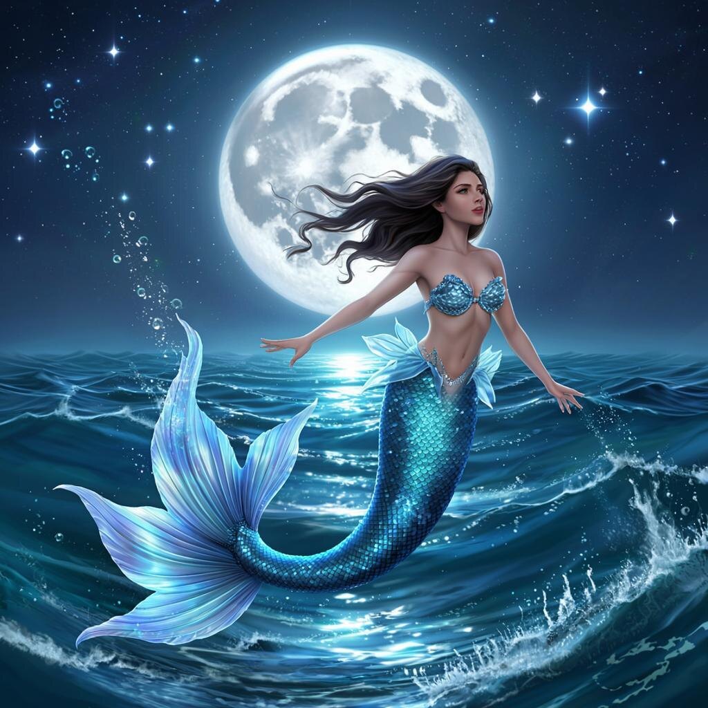 Через несколько минут вода вдруг забурлила, и из глубины поднялась она. Русалка. Длинные, распущенные волосы колыхались на волнах. Ее лицо, почти неземное, дышало спокойствием и мудростью, но более всего поражали глаза – блестящие, синие, казалось в них отражались звезды. От нее исходил странный, мягкий свет, окутывающий ее аурой тайны и волшебства, словно от жемчужины, извлеченной из самой глубины.