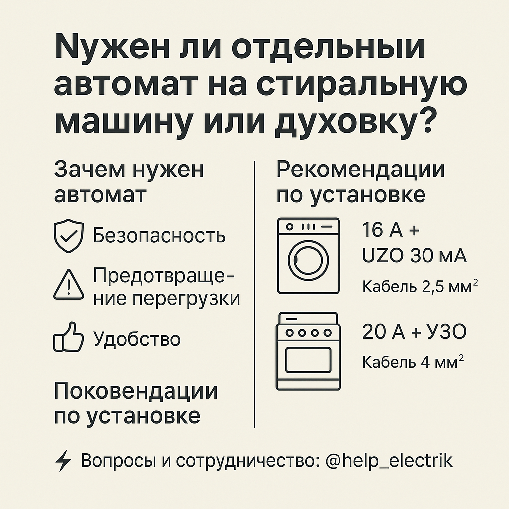 Многие подключают стиральную машину, духовку и другую мощную технику через обычную розетку на общей линии. Это не только неудобно, но и опасно. --- Почему нужен отдельный автомат 1. Безопасность Если прибор выйдет из строя или произойдёт утечка тока, автомат отключит только его линию, не обесточивая всю квартиру. 2. Предотвращение перегрузки Современные стиральные машины и духовки потребляют много электроэнергии. Общая линия может не выдержать, что приведёт к перегреву проводки и риску пожара. 3. Удобство В случае ремонта или замены техники можно отключить только нужную линию, не трогая остальную сеть. --- Рекомендации по установке Стиральная машина — автомат 16 А + УЗО 30 мА. Духовка — автомат 20 А (или по паспорту техники) + УЗО. Кабель — сечением 2,5 мм² для стиральной машины и 4 мм² для духовки. Линия должна быть отдельной от щитка. --- ✅ Вывод: отдельный автомат — это не роскошь, а элемент безопасности. Он защищает вашу проводку, технику и жильё от аварийных