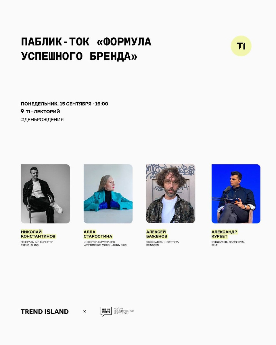Всем привет! Нашим партнерам TREND ISLAND исполняется 9 лет! А это значит, что они приготовили для вас кое-что интересное! Паблик-ток TREND ISLAND + BeInOpen. «Как создать успешный бренд. Формула» В public-talk примет участие наш основатель - Александр Курбет! В рамках сессии эксперты поделятся проверенными формулами успеха, расскажут, какое ключевое действие необходимо предпринять вашему бренду прямо сейчас, а также раскроют структуру матрицы компетенций,критичных для индустрии моды. Вы узнаете, как определить пробелы в знаниях и навыках вашей команды, чтобы эффективно их закрыть. Паблик-ток станет практическим гидом для дизайнеров, предпринимателей и всех, кто хочет построить сильный, конкурентоспособный бренд в условиях высокой конкуренции и быстро меняющихся трендов. 🕐Когда? 15 сентября 📍Где? Лекторий «Trend Island», ТЦ «Авиапарк» Спикеры: - Алексей Баженов, бизнес-клуб Альянса Beinopen; - Николай Константинов, генеральный директор Trend Island; - Алла Старостина, инвесто