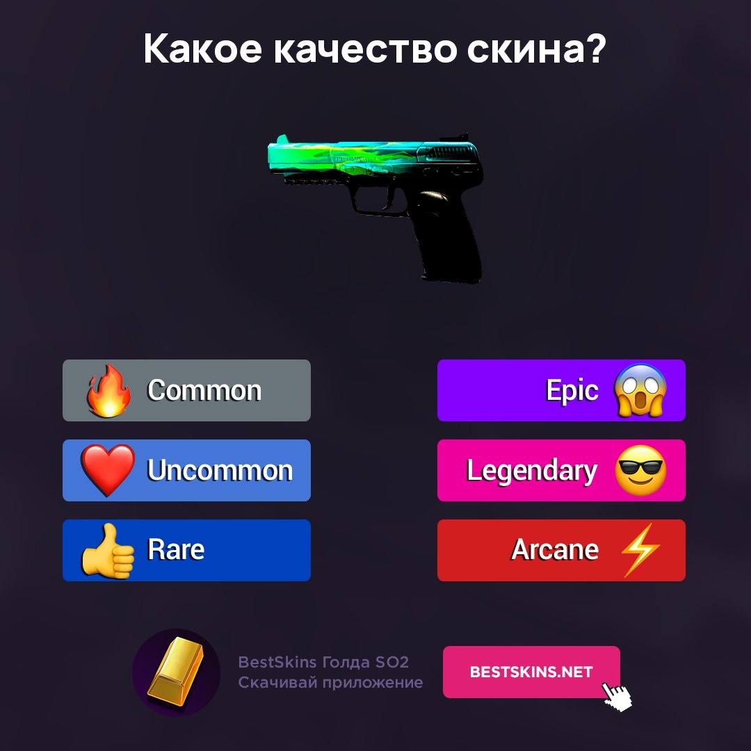 Какое качество скина? BestSkins SO2 Common, Uncommon, Rare или Arcane? Ставь реакцию — проверим, кто шарит! 🔥 ❤️ 👍 😱 😎 ⚡️ 📲 Скачать - https://bestskins.net