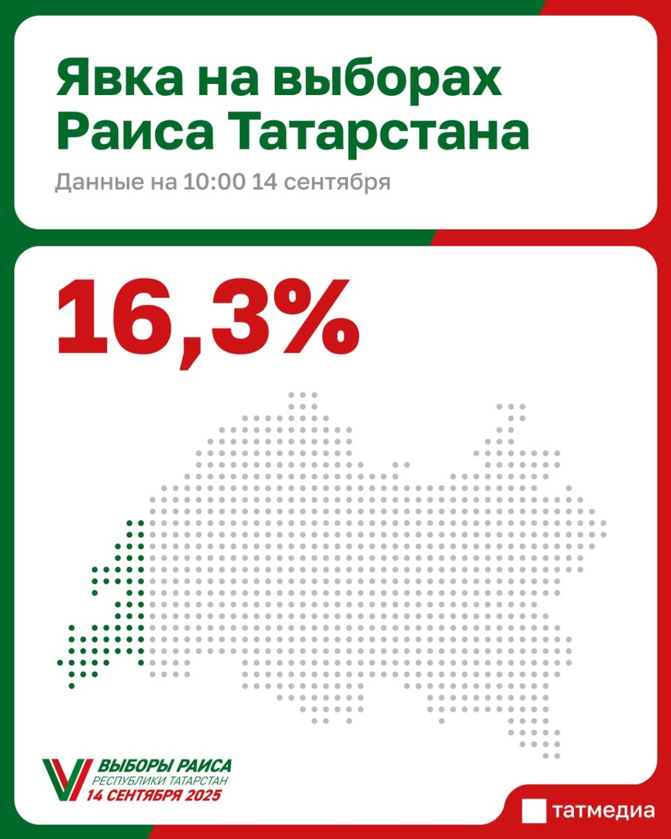 В ответ на пост 🗳✅На 10:00 в Татарстане проголосовало 16,3% от общего числа избирателей Жалоб на нарушение избирательного законодательства, влияющих на ход голосования, в ЦИК РТ не поступало. Голосование продолжается, избирательные участки открыты до 20:00 по московскому времени. @tatmediaofficial | Все каналы Татмедиа ™️ 1-й новостной MAX-канал Татарстана - подпишитесь.