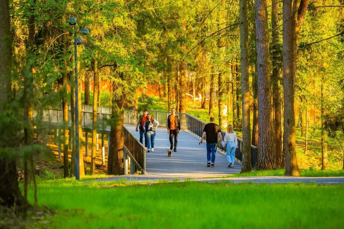 В этой локации вас ждут живописные виды, воздух, пропитанный ароматом хвои и чудесные прогулочные дорожки, протяженностью около 8 км. На территории парка есть разные спортивные и детские площадки и веревочный городок.