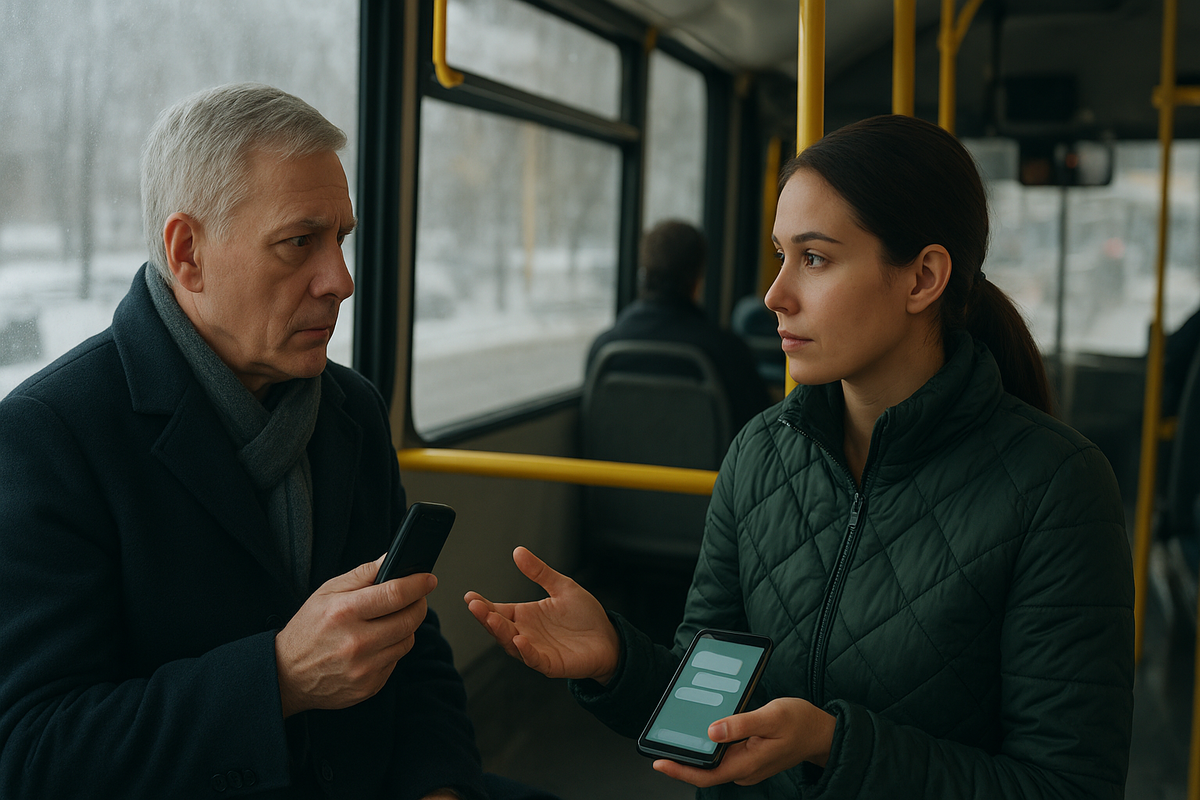Пётр протиснулся на свободное двойное сиденье у окна, но в последний момент рядом опустилась молодая женщина в тёмном пальто. Она пахла холодом и чем-то аптечным, глянула коротко и вынула телефон. Сразу же начала печатать, большие пальцы мелькали, как у пианистки. Пётр перехватил взглядом: в отражении стекла плясали строки. Он не читал, не был хамом, но заметил — быстро мелькают одинаковые имена.