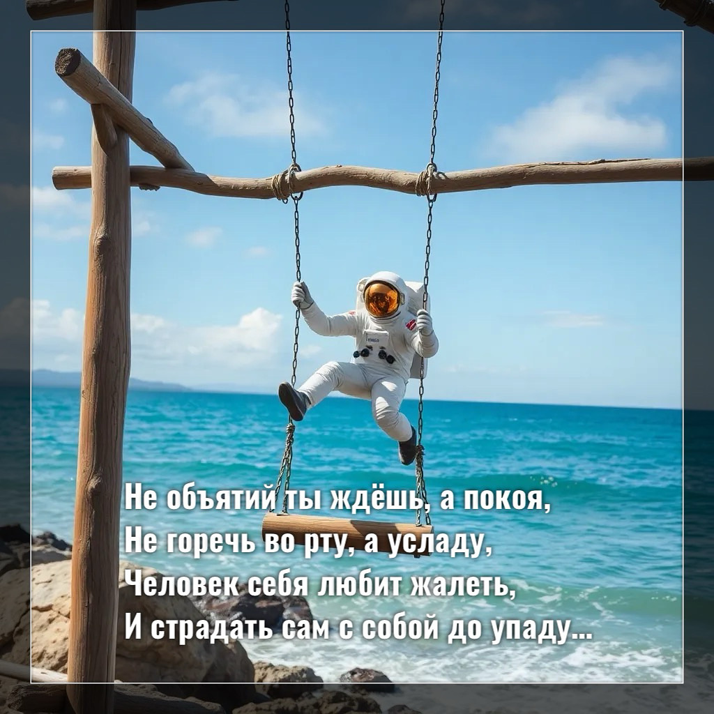 Не объятий ты ждёшь, а покоя, Не горечь во рту, а усладу, Человек себя любит жалеть, И страдать сам с собой до упаду, Без страданий ему в жизни скучно, Всех осудит вокруг, обвинит, Так же легче гораздо жить, Когда сердце своё не болит И обиды не разъедают, Виноватых вокруг полно, Но в себя заглянуть не решается, С чем живёт сам внутри - всё равно, От этого непонимание, От этого тело страдает, Как хорошо тому, Кто роль здесь свою понимает, И дальше познать стремится Грани свои и суть, Не давайте себе в страданиях Глубоко и навечно уснуть.