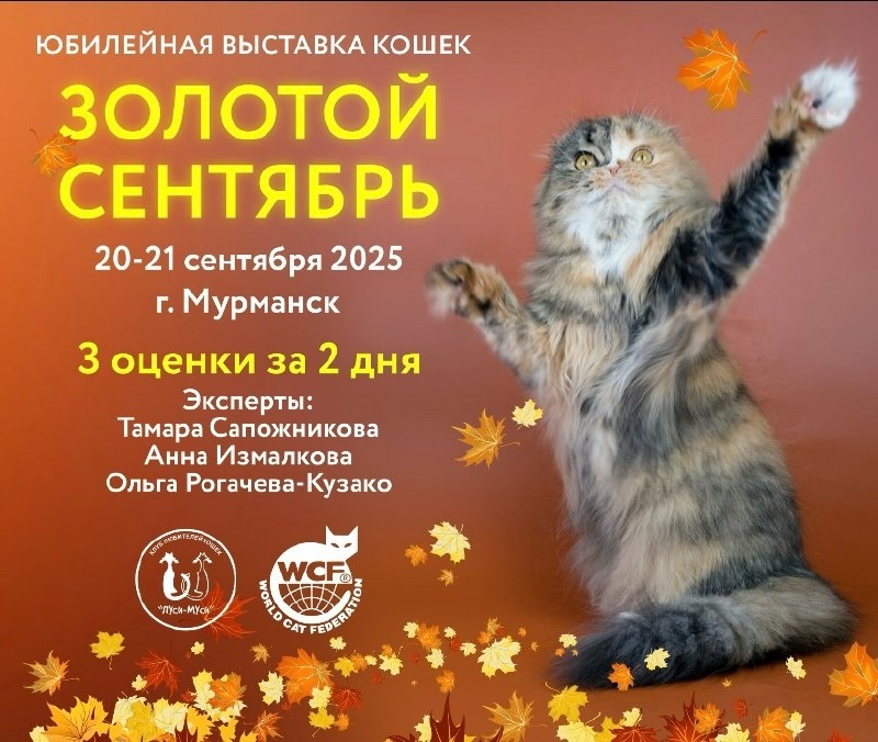 ⏰ 20 - 21 сен (6д) 🏛 #Мурманск #Россия #Выставка 😽 Выставка кошек и котов: ЗОЛОТОЙ СЕНТЯБРЬ 🏆 Клуб любителей кошек «Пуси-Муси» Контакты организаторов здесь: 🌐 https://www.sunny-cat.ru/vystavki-koshek.php?mesto=110-murmansk ЮБИЛЕЙНАЯ международная выставка кошек «ЗОЛОТОЙ СЕНТЯБРЬ» При желании 3 оценки за 2 дня!!!! 20 сентября - 2 экспертизы 21 сентября - юбилейный день с двойными баллами (Юбилейный Ринг) В программе выставки: WCF РИНГИ: молодых животных (котята и юниоры отдельно при наборе необходимого количества) 2 дня!!!; взрослых животных - 2 дня!!!; кастрированных животных (при наборе необходимого количества) – 2 дня!!!!; домашних и непризнанных (при наборе необходимого количества) – 2 дня!!!!; юбилейный ринг - воскресенье MONOBREED SHOW (при наборе необходимого количества): британская BLH+BRI, шотландская SFS+SFL+SFS71+SFL71, мейн-кун MCO, сибирская SIB Fun show: *Шоу кошек с длинной шерстью *…