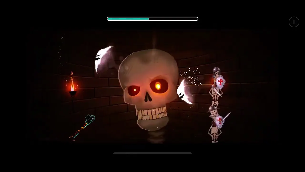 Всем привет! В Геометрии Деш есть много триггеров, с помощью которых можно делать боссфайты. Можно создать обычный простой боссфайт, а можно и постараться, сделать что-то хорошее и красивое. Сегодня я расскажу вам про самые популярные и проработанные боссфайты, когда-либо созданные игроками. Это вообще самый проработанный Medium Demon в игре. Но в этой статье мы обсуждаем именно боссфайты, поэтому я воспользуюсь своим телепортом и перемещусь на место боссфайта. Сначала мы видим огромного скелета, который зачем-то съедает луну. Потом он начинает атаковать нас огненными шарами, а позже к нему присоединяются помощники, атакующие магическими искрами, стрелами и призраками, которых можно увидеть на картинке снизу. Мне кажется, что это самый проработанные боссфайт в игре. Ну посмотрите на эти эффекты, частицы, декорации! Ещё я хочу сказать про анимацию - в этом уровне анимировано почти всё! Создатели уделяли время каждому скелету: всё должно быть в наилучшем виде. Они даже не поленились сдел