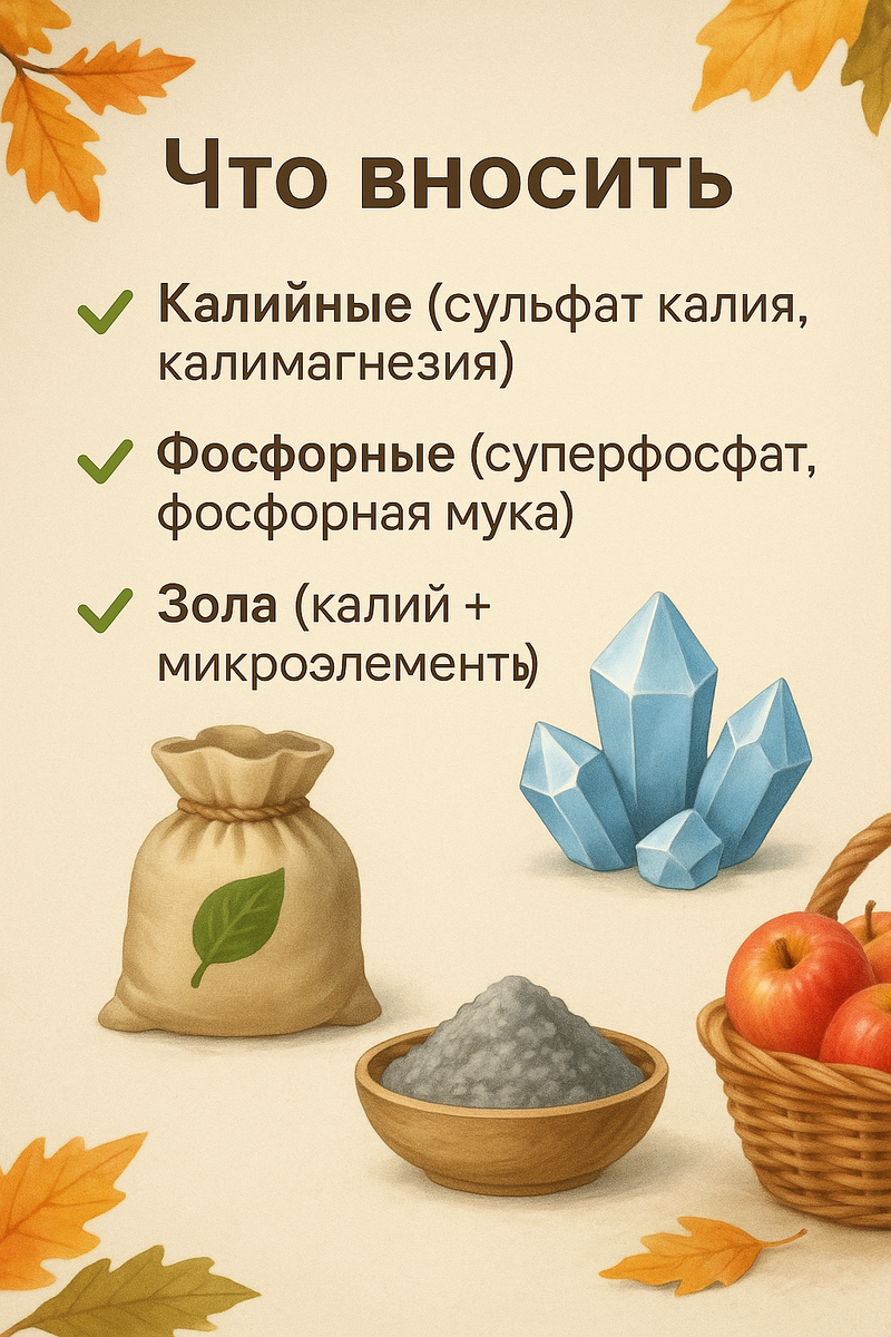 🍂 Главная цель осеннего питания — укрепить корни и подготовить ткани растений к зиме, а не стимулировать рост побегов. Поэтому выбираем удобрения с высоким содержанием калия и фосфора, а также натуральные минеральные добавки.