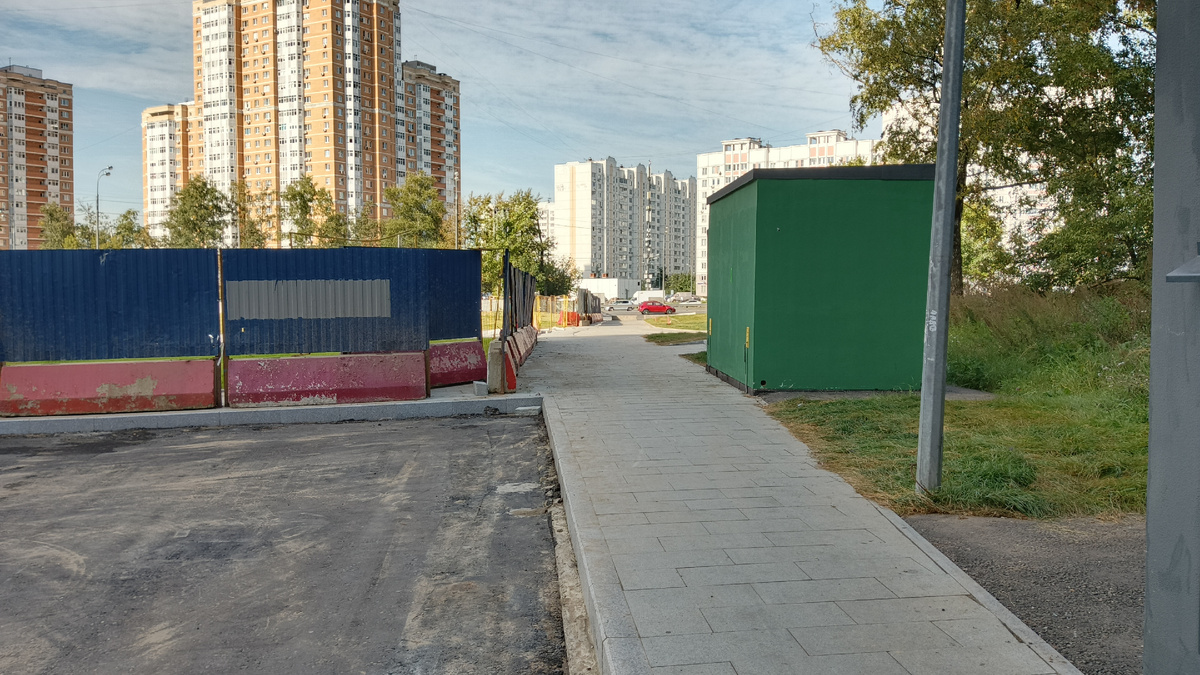 Для начала приведу фото, сделанные 14.09.2025, когда я прогулялся к северному торцу стройки. Готовая дорожка от леса к Дмитровскому шоссе. Граница старой и новой дороги вокруг корпуса 1 дома 124А по Дмитровскому шоссе. Готовая парковочная площадка. Участок, где ещё совсем недавно была траншея. Но работы по кабельному коллектору пока не завершены, отсюда такой интересный аппендикс. Парковка, вид с другой стороны. Также на днях заасфальтировали все подходы к магазинам. Проезд со стороны 5 корпуса перекрыт. Не забыли и про маленькую лазейку на углу 1 корпуса. В целом местный проезд практически готов, но есть одно жирное НО, которое хорошо видно на всех фотографиях: от Дмитровского шоссе до КПП "Северной Слободы-2", а также от неё и до леса предстоит укладывать второй слой асфальта, и только после этого все ограничения будут сняты. А теперь к делам сегодняшним. Завезено несколько фур плитки, но её укладка идёт темпами, далёкими от ударных. Стройгородок выезжать никуда не собирается, заним