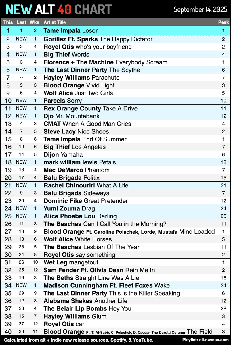 BIG THIEF, THE LAST DINNER PARTY, PARCELS, REX ORANGE COUNTY, DJO и MARK WILLIAM LEWIS также дебютировали новыми синглами в первой половине чарта.