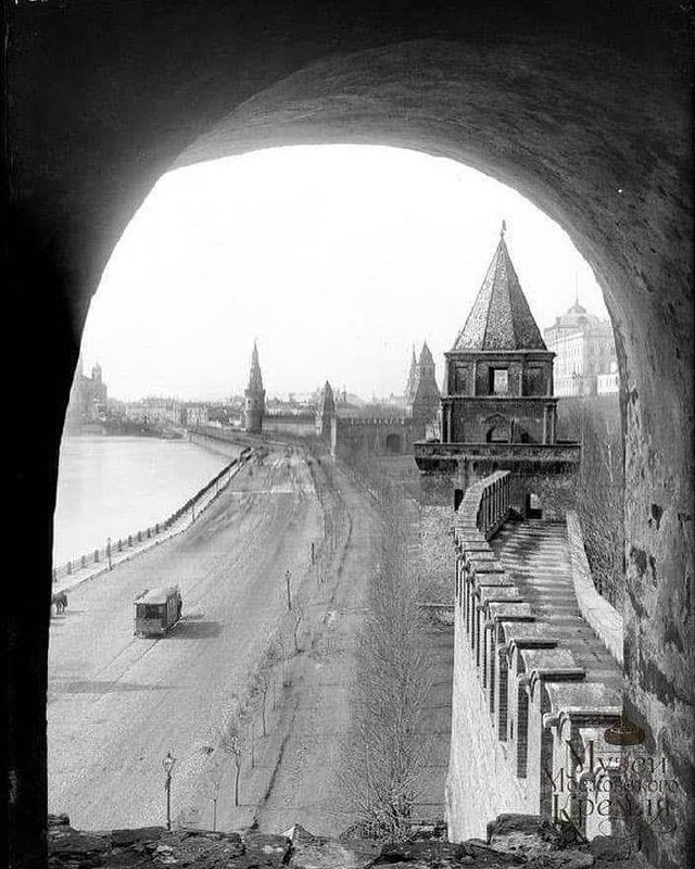 Кремлёвская стена через одну из широких бойниц на Беклемишевской (Москворецкой) башне, которая, как и другие, при реставрации 1934-1936 годов была заложена