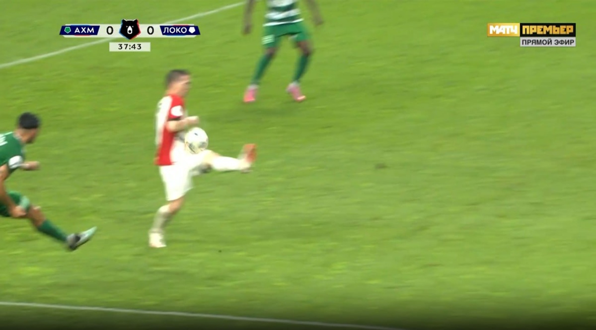 Ахмат-Локомотив 38 мин. Правильное решение принимает Левников и продолжает игру. Мяч попадает в руку игроку команды Локомотив, который находился в штрафной площади. Руку прижата к телу и считается не наказуемой. Правильное решение: Продолжить игру