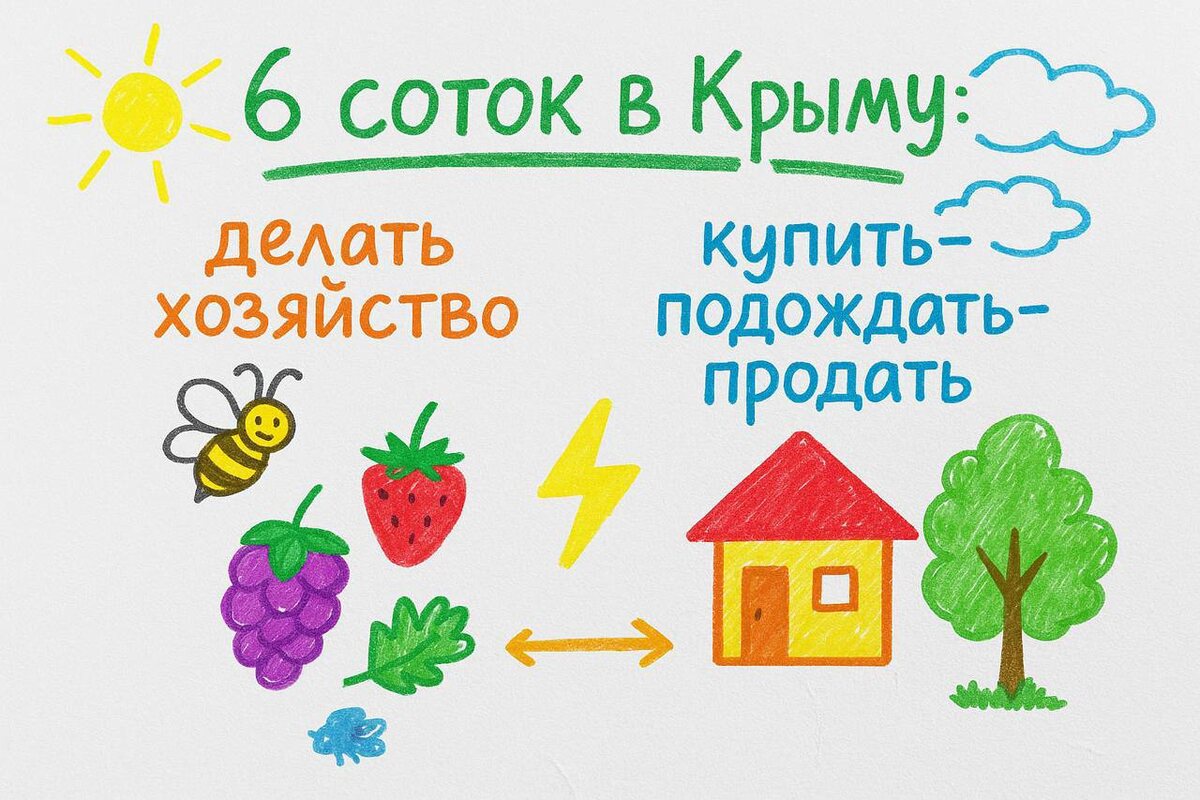 продолжим тему ———— сотки в Крыму: вести хозяйство или перепродажа? Многие думают: если участок сельхозназначения, то доход только от хозяйства ( как мы рассмотрели выше ). Но есть и другой путь — инвестировать в землю под застройку (ведение садоводства) и перепродать через 2 года. Рассмотрим на примере: участок 6 соток • Цена входа: 750 000 ₽ • Рост в локации: \~30% в год. Берем в полне реальные показатели по Крыму за последние два года • Горизонт: 2 года. Сценарии: ⏺Консервативно (20%/год): 1 080 000 ₽ → +330 000 ₽. ⏺Рыночно (30%/год): 1 267 500 ₽ → +517 500 ₽. ➖Горячая локация + «доведение» (value-add): 1 457 000 ₽ → +707 000 ₽. ❓Сравнение с хозяйством ✅Теплицы: дают выручку, но это бизнес с трудозатратами. ✅Пасека: мягкий доход, сезонный. ✅Виноград/орех: ждём 3–10 лет. 💰А перепродажа садоводства — это чистая инвестиция, которая может принести до +90% номинально всего за 2 года. 💡Итого: Если цель — быстро и пассивно приумножить капитал, то перепродажа земли под строител
