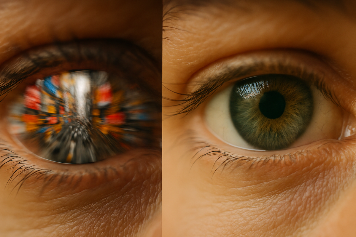 Почему мы устаем от того, что видим Иногда мы смотрим на мир, который кажется нам слишком шумным. Случалось такое? Вы идете по улице, вроде бы не в шумном месте, но всё вокруг будто кричит. Яркие вывески, мелькающие экраны, витрины, отражения, цвета без логики – визуальная среда становится настолько насыщенной, что хочется отвернуться или даже закрыть глаза. Это и есть визуальный шум. Другими словами – избыток зрительных стимулов, которые мозг не успевает обработать. Он не связан с плохим зрением или беспорядком в привычном смысле. Это перегруз, при котором даже привычные объекты начинают восприниматься как раздражители. И хотя мы редко говорим о нем вслух, его влияние на зрение и общее самочувствие вполне измеримо. Как визуальный шум влияет на нас? По данным исследований, визуальный шум снижает точность обработки зрительной информации. В условиях перегрузки нейроны в зрительной коре работают менее эффективно, особенно в периферийном поле зрения. Это означает, что даже при хорошем зрен