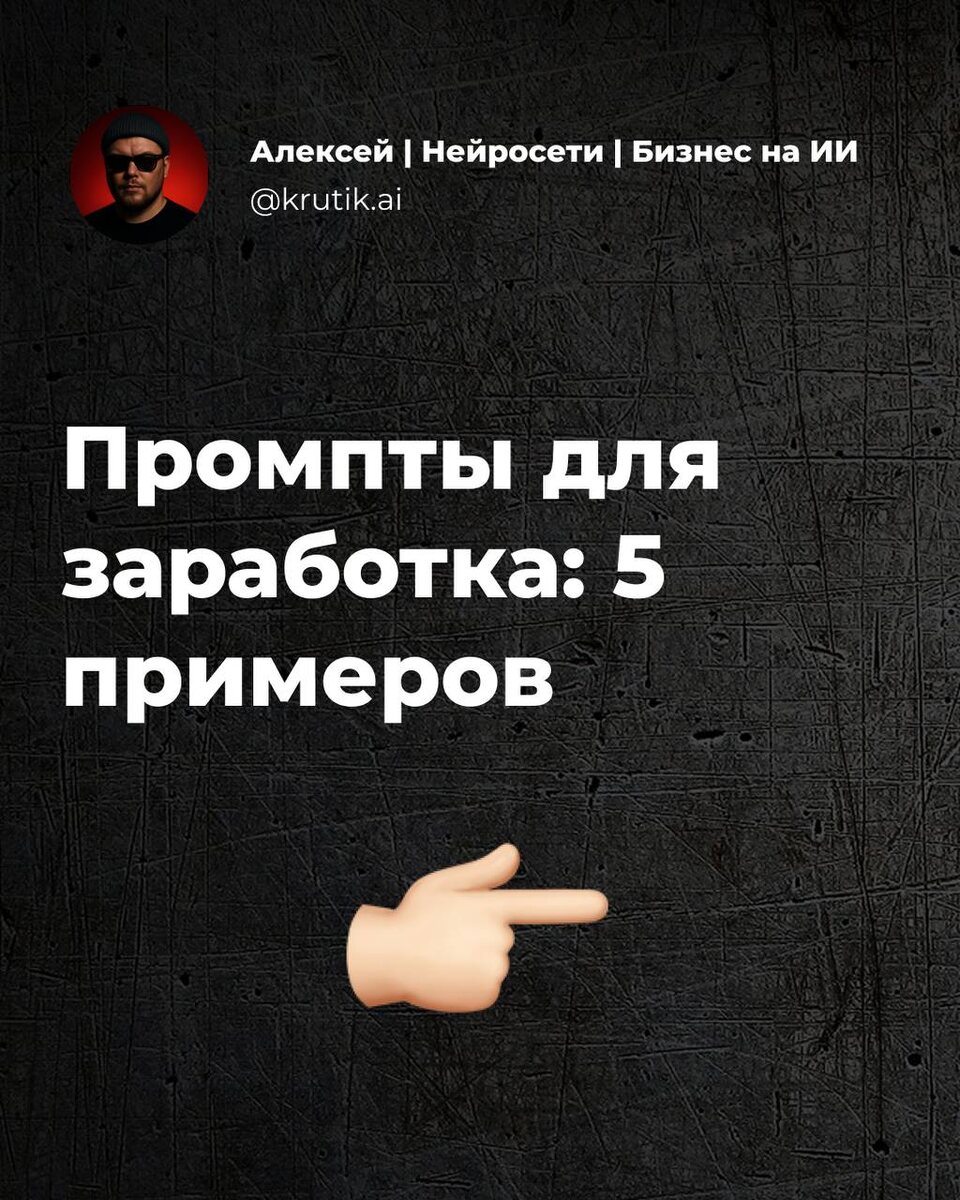 5 лаконичных промптов ChatGPT, чтобы работать быстрее и зарабатывать больше⬇️ 1️⃣ Контент-план “Составь календарь из 10 постов по теме <НИША> с идеями заголовков и коротким описанием для каждого. Цель – привлечь клиентов и повысить вовлечённость аудитории.” 2️⃣Коммерческое предложение “Напиши продающее письмо для потенциального клиента, предлагающее услуги <ТВОЯ УСЛУГА С ИИ>. Подчеркни выгоды: экономия времени/денег, инновационный подход, результат в короткие сроки.” 3️⃣ Анализ рынка “Проанализируй популярные запросы и проблемы целевой аудитории в нише <НИША>. Выведи 5 самых острых проблем, которые можно решить с помощью ИИ-сервиса или консультации.” 4️⃣ Оптимизация работы “Ты – эксперт-ассистент. Помоги мне составить список из 5 задач по <ТВОЯ ДЕЯТЕЛЬНОСТЬ>, которые можно автоматизировать или ускорить с помощью ИИ-инструментов. Опиши конкретные инструменты или методы для каждой задачи.” 5️⃣ Генерации идей дохода “Предложи 5 нестандартных способов монетизации навыка <ТВОЙ НАВЫК>