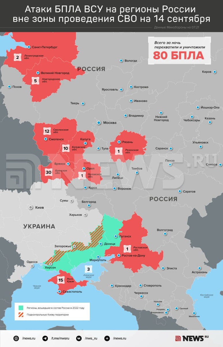 30 БПЛА сбили над Брянской областью, 15 — над Крымом, 12 — над Смоленской областью и 10 — над Калужской областью. Подробнее смотрите в нашей инфографике.
