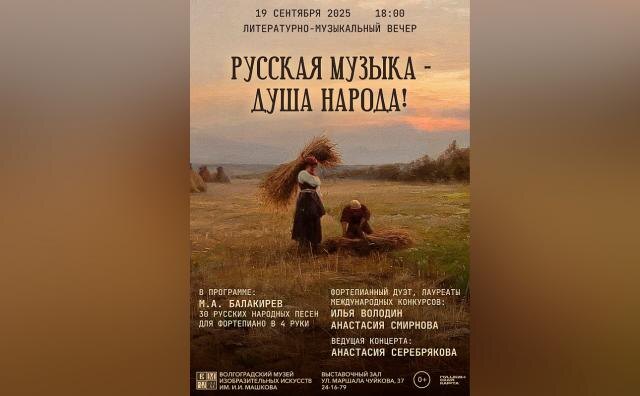 Выставочный зал Волгограда приглашает на литературно-музыкальный вечер «Русская музыка — душа народа». В музее впервые выступят молодые волгоградские музыканты, лауреаты Всероссийских и Международных конкурсов, пианисты Анастасия Смирнова и Илья Володин. Ведущая концерта — Анастасия Серебрякова.