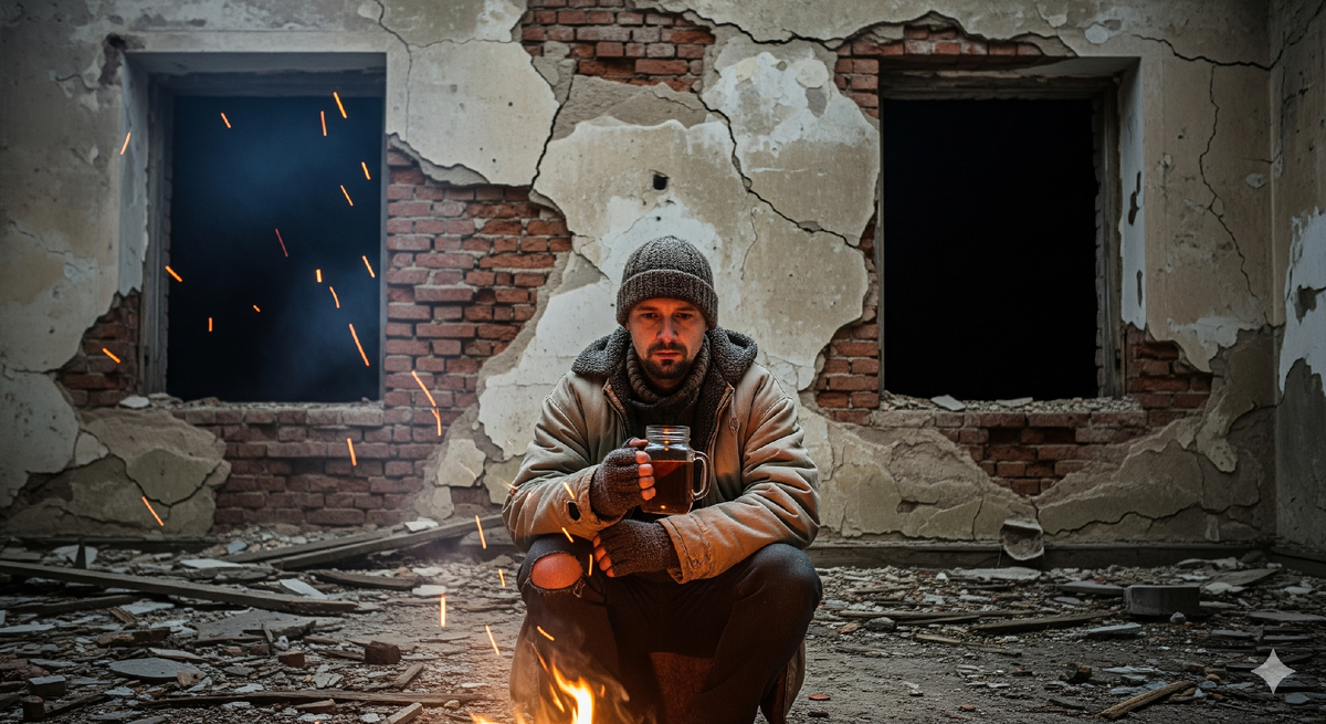 Расплывчатый свет вывел его к окраине: полузаброшенные дома с выбитыми окнами, следы старых костров, нависший запах прелой тряпья и какой-то застарелой безнадёги.