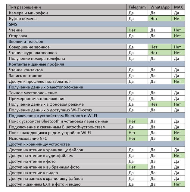 1⃣ MAX оказался скромнее Telegram и WhatsApp в своих запросах данных.