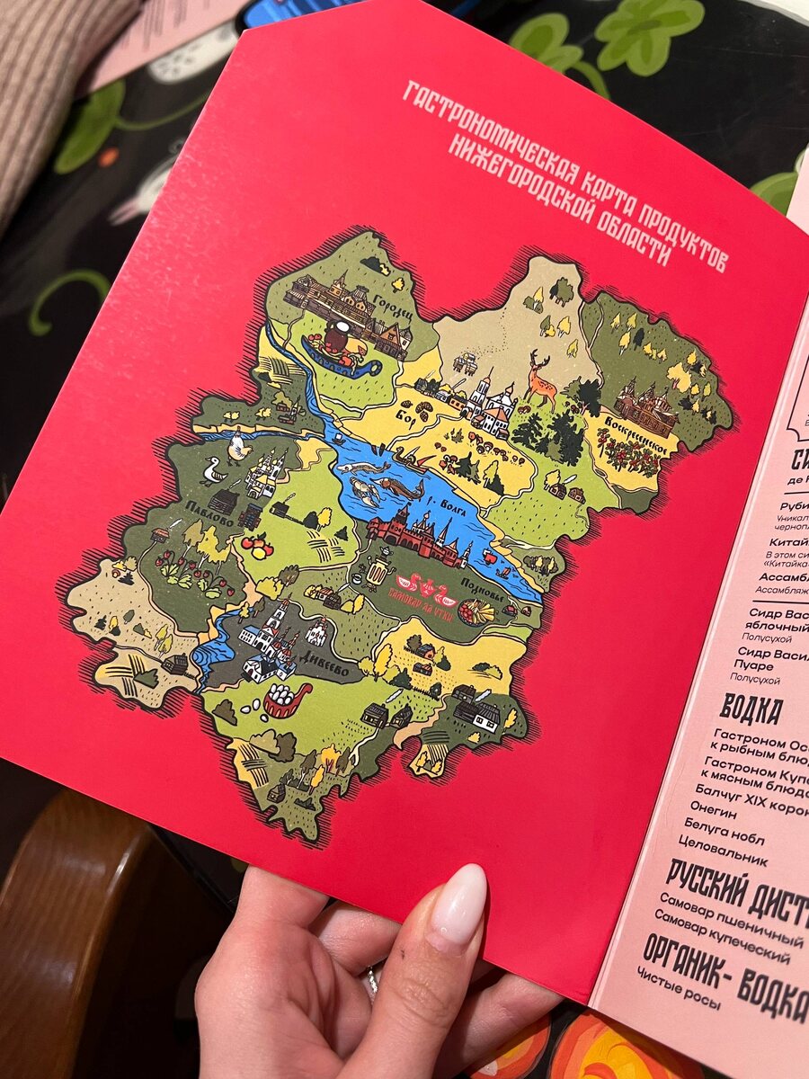 Последнему пункту уделяется особое внимание. В меню даже есть отдельный лист с гастрономической картой Нижегородской области — родиной продуктов, которые мы с вами пробуем в самом сердце Нижнего Новгорода.