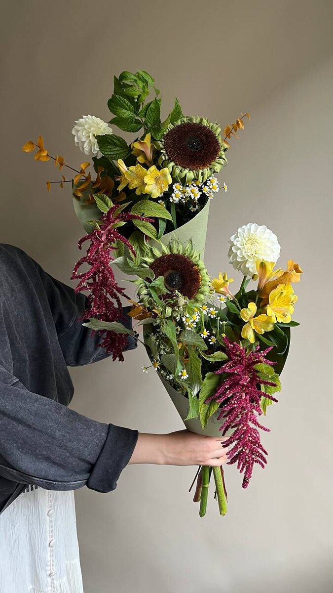 Осень в букетах 💐 Яркая, уютная, теплая и такая любимая: 🤩 в зеленом 2400 вместо 2900.- Подсолнух/амарант/далия/альстромерия/танацетум/эвкалипт/малина 🧥 в красном 2950 вместо 3650.- Гортензия/далия/твидия/диантус/котинус/роза Джульетта/стифа 🌱 в персиковом 2900 вместо 3600.- Далия/роза Цумуги/диантус/вибурнум/физалис/стрелиция/малина/эвкалипт Для заказа: @mateflowers_bot