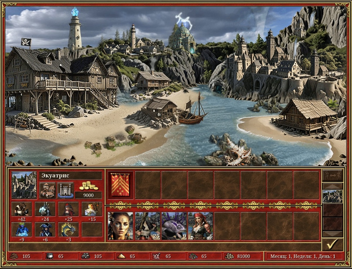 Мне очень понравилось, как выглядит и экран города, и сам город на стратегической карте. Вот заходишь ты в эту пиратскую бухту, и тебя всего охватывает чувство безграничной свободы с солёным морским привкусом. Нет тесных городских стен, нет давящих сводов пещер или свисающих крон древних деревьев — только море, песок, солнце и свежий ветер. Живи в наскоро сколоченных лачугах и наслаждайся каждым днём, так как он может стать последним. И, кстати, нельзя не отметить несколько отсылок к Might and Magic VIII: Day of the Destroyer, о которых мы поговорим, когда будем разбирать существ.