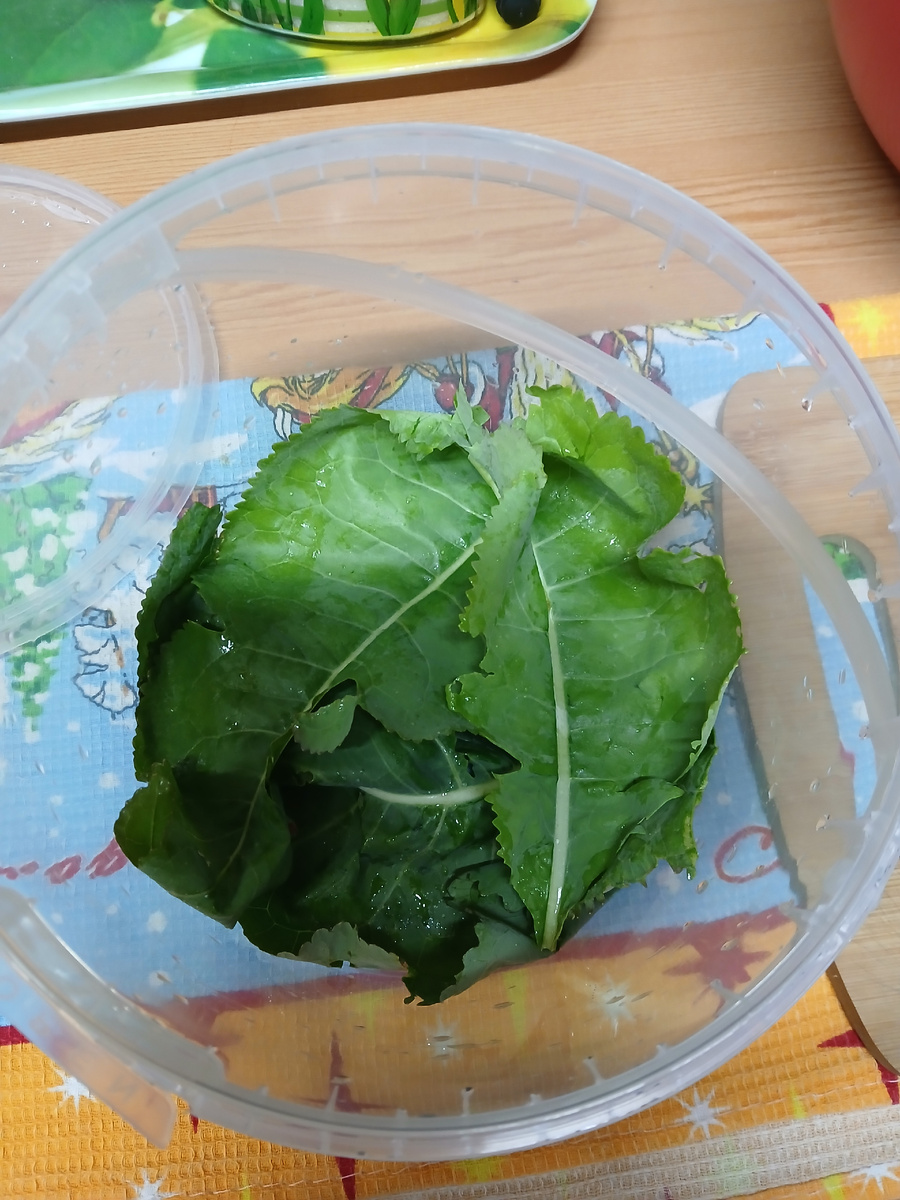 В промытое содой ведро укладываем свежие листья хрена.