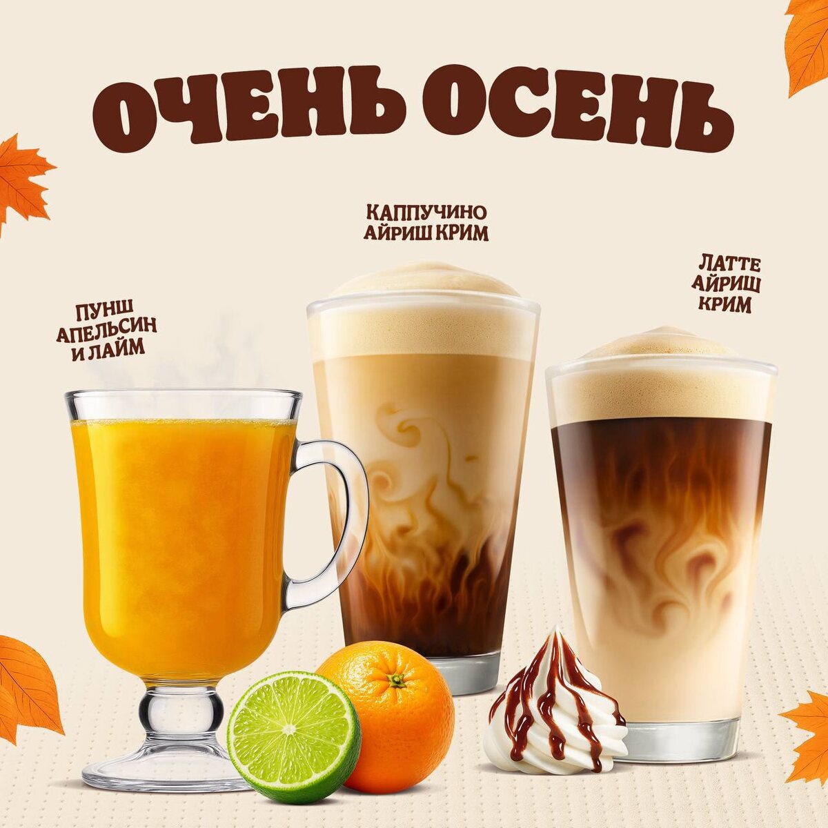 Кааайф, осенние напитки завезли в Бургер Кинг. Теперь в ресторанах можно заказать пунш со вкусом апельсин-лайм и кофе со вкусом ликера с ирисками.